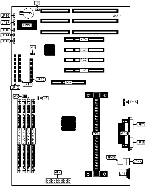 32-bit PCI slots (4), floppy drive interface, IDE interfaces (2), parallel port, PS/2 mouse port, serial ports (2), IR connector, USB connectors (2), AGP slot, ATX power connector