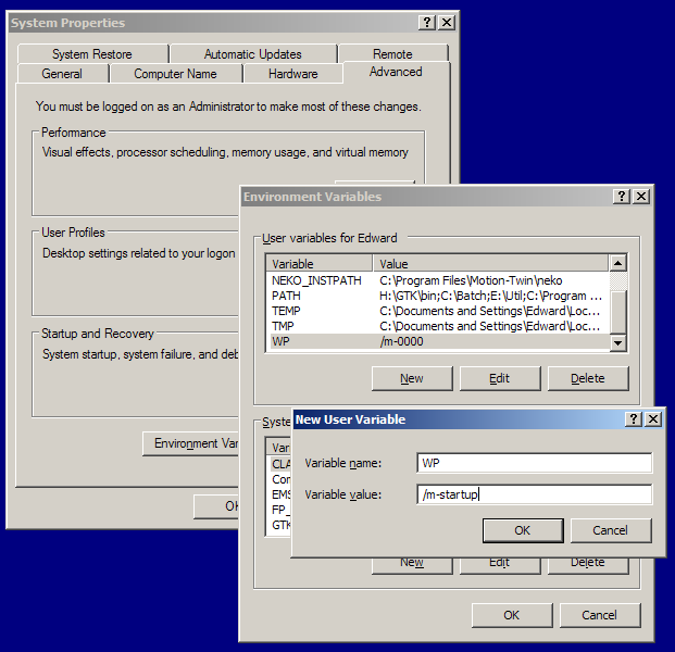 These switches may be used on the command line, or in batch files, and it highly convenient to add them to any desktop shortcut that runs WordPerfect, by adding them to the Program tab of the shortcut, as described on another page. However, if you have any switches that you want to use every time you run WPDOS, whether from a shortcut or the command line, or any other way, it is convenient to add them to the "environment" so that they run automatically whenever WPDOS is launched. The following techniques add switches to the environment under different versions of Windows:
