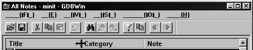 At the bottom of the GDBWin window, there are buttons that emulate the function keys on the Palmtop. The F1(Help) button is greyed out but the F2 (Add) through the F10 (Close) buttons are there and operate in much the same fashion as they do on the Palmtop. You can click the F3 button (or press the F3 function key) to display the Notes field, press F5 to create or modify a Subset definition, etc. You can also press the CTRL+D key to open or close a Data Card view. The only function key that doesn't work is the F8 (Columns) key. However, if you want to widen a column, you can use the Windows technique of dragging the separator bar in the top row of the list view. (See coldrag.gif.)